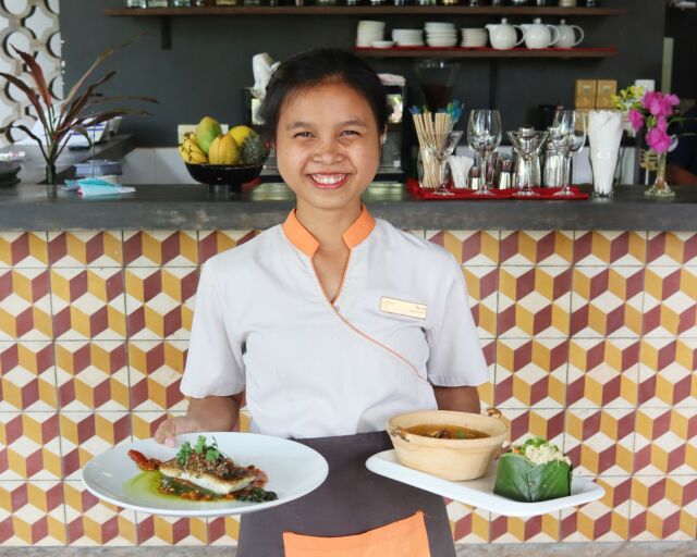Set on the riverside in a serene tropical garden, Sala Baï Hotel School offers travelers a unique and human hospitality experience through its training hotel, restaurant, spa, and boutique shop. Guests enjoy high-quality service delivered by students trained to work in 4 to 5 star hotels and restaurants. Along with their meal, stay, or massage, travelers can visit the school and explore the workings of an NGO program that trains underprivileged young Cambodians