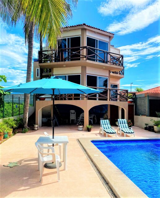 Two-bedroom beachfront rental apartment with a pool, comfortably furnished throughout. Air-conditioned bedrooms with ceiling fans, one with a queen-size bed and the other with two full-size beds. The kitchen is fully equipped including a refrigerator, gas stove, microwave oven, coffee maker, blender, cooking utensils, and a full set of dishes. There's a living and dining room with a lovely view of the pool and ocean, a bathroom with a shower, hot water, and a flatscreen TV with cable and internet service. The guesthouse is run by Ayotlcalli Turtle Rescue & Conservation Centre which can be visited by arrangement.
